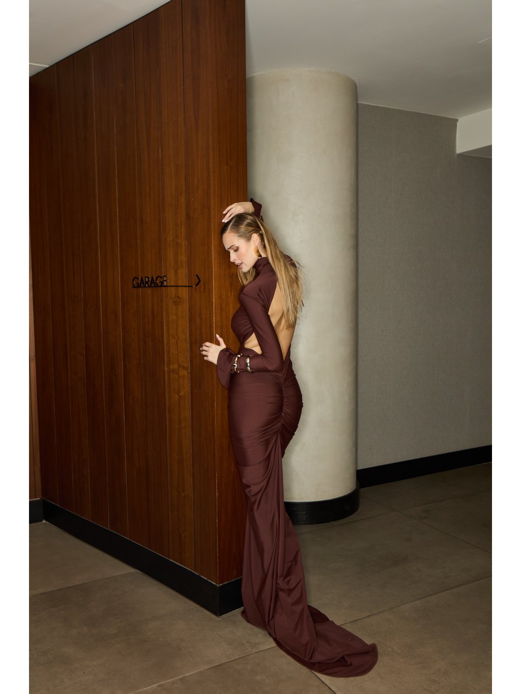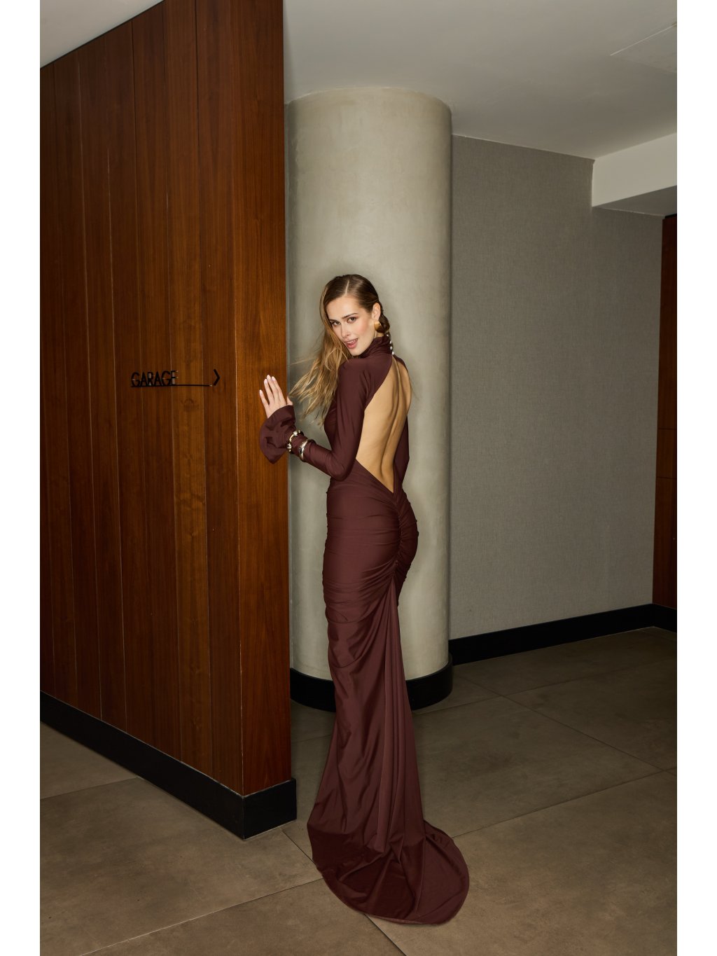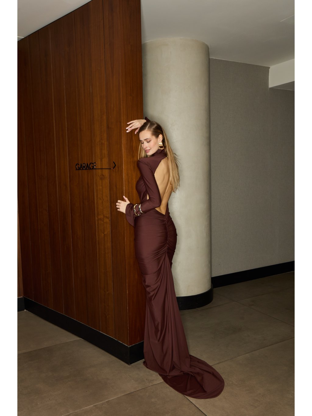 Sochařská silueta, která se pohybuje s tělem jako temná vlna. Šaty z jemného, pružného materiálu obepínají postavu, vytvářejí hluboké řasení a vykreslují ženské linie s...