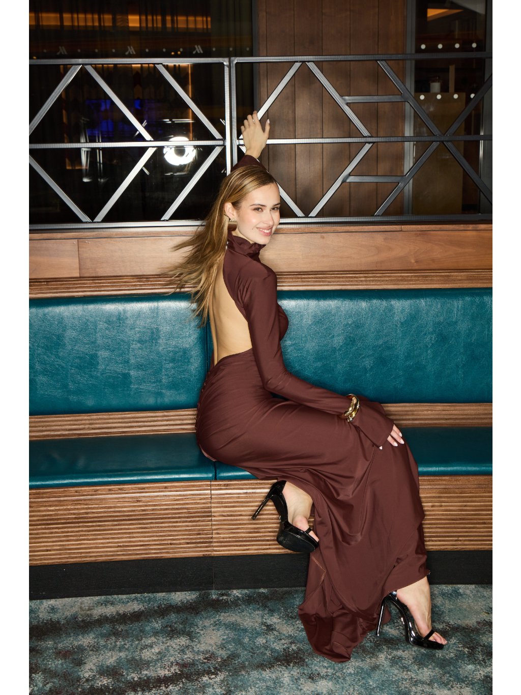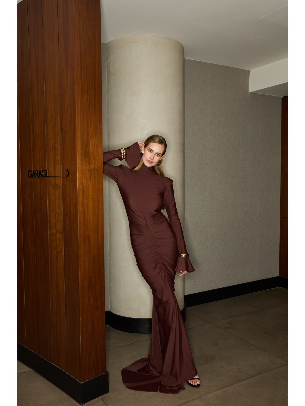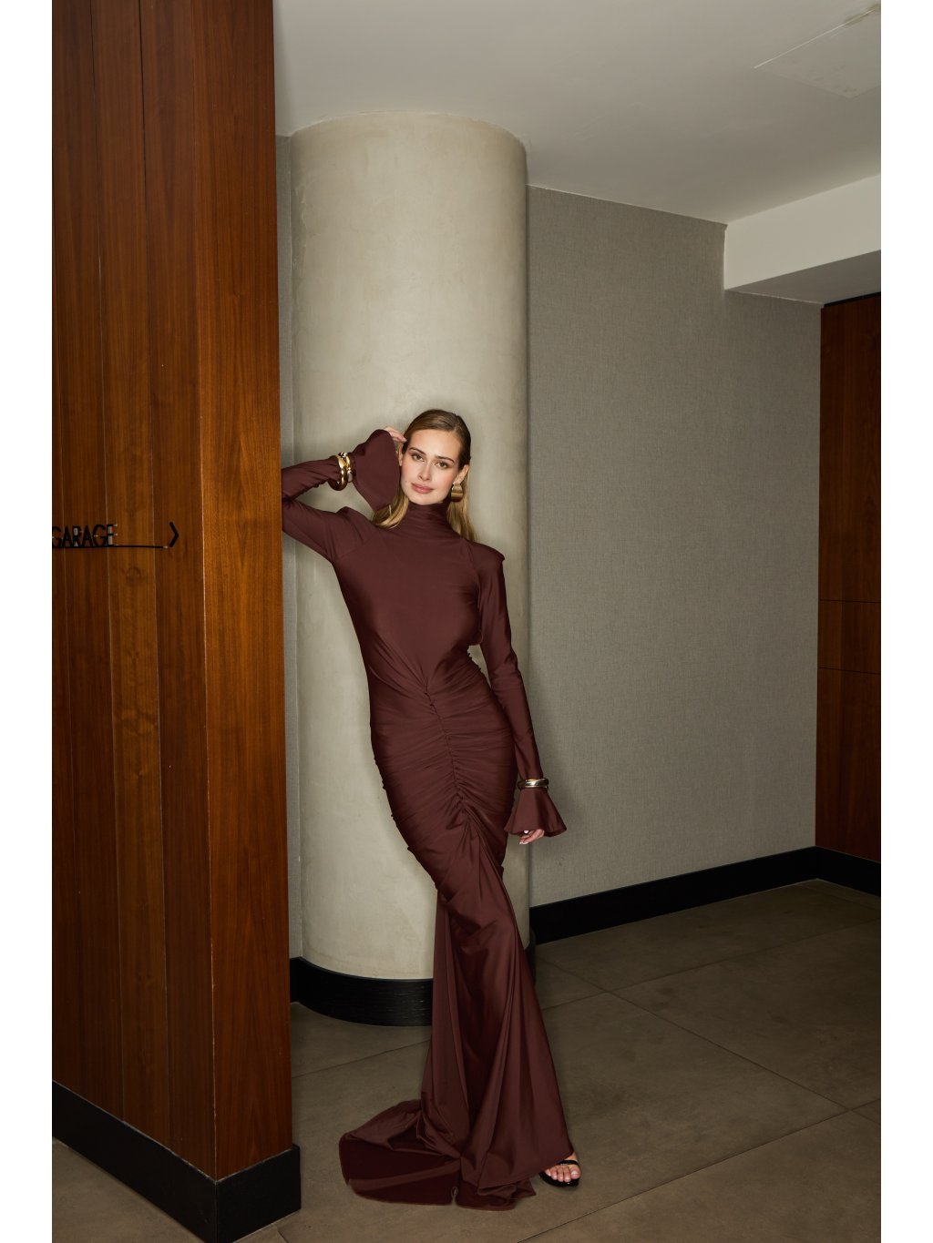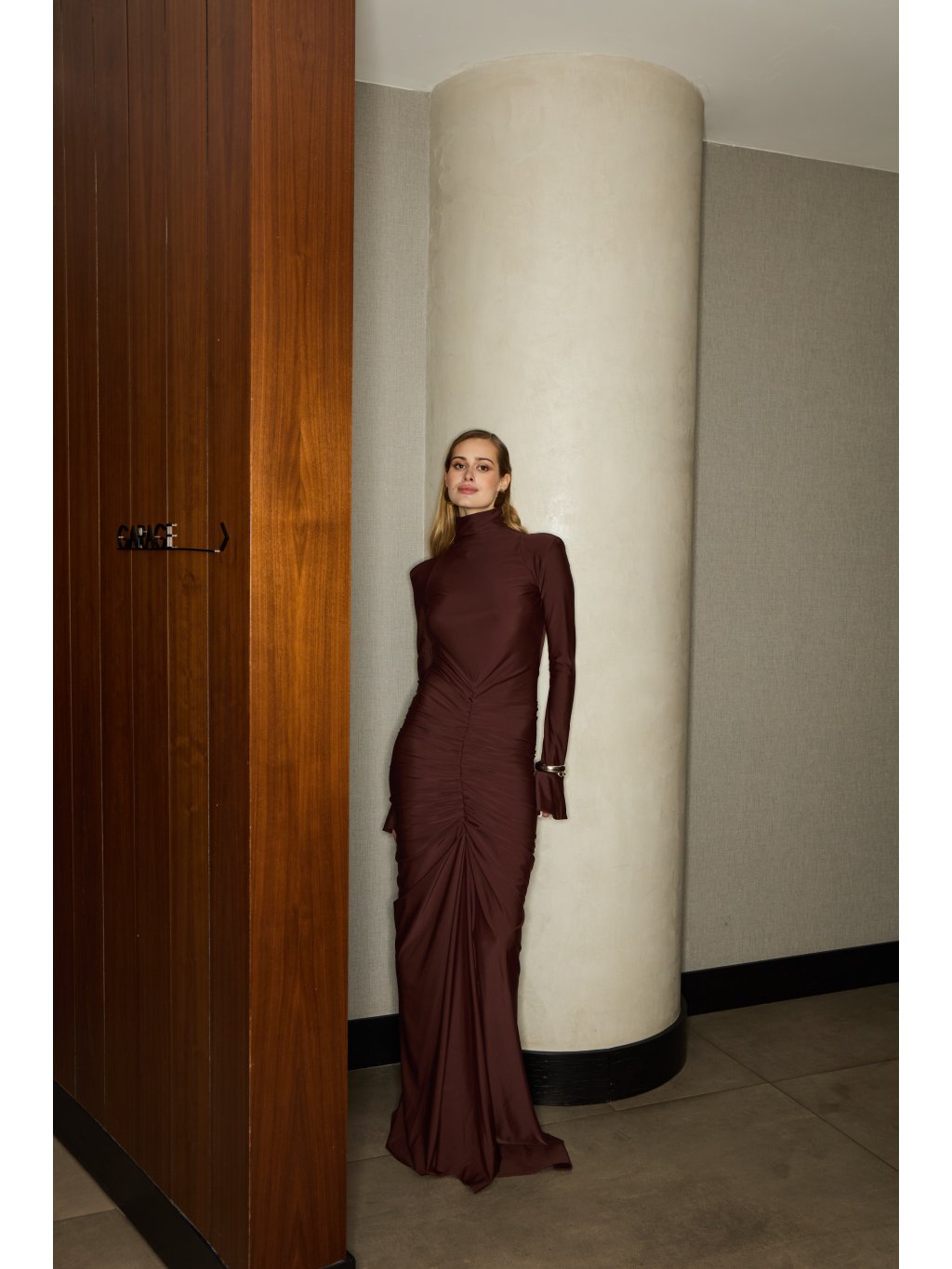 Sochařská silueta, která se pohybuje s tělem jako temná vlna. Šaty z jemného, pružného materiálu obepínají postavu, vytvářejí hluboké řasení a vykreslují ženské linie s...