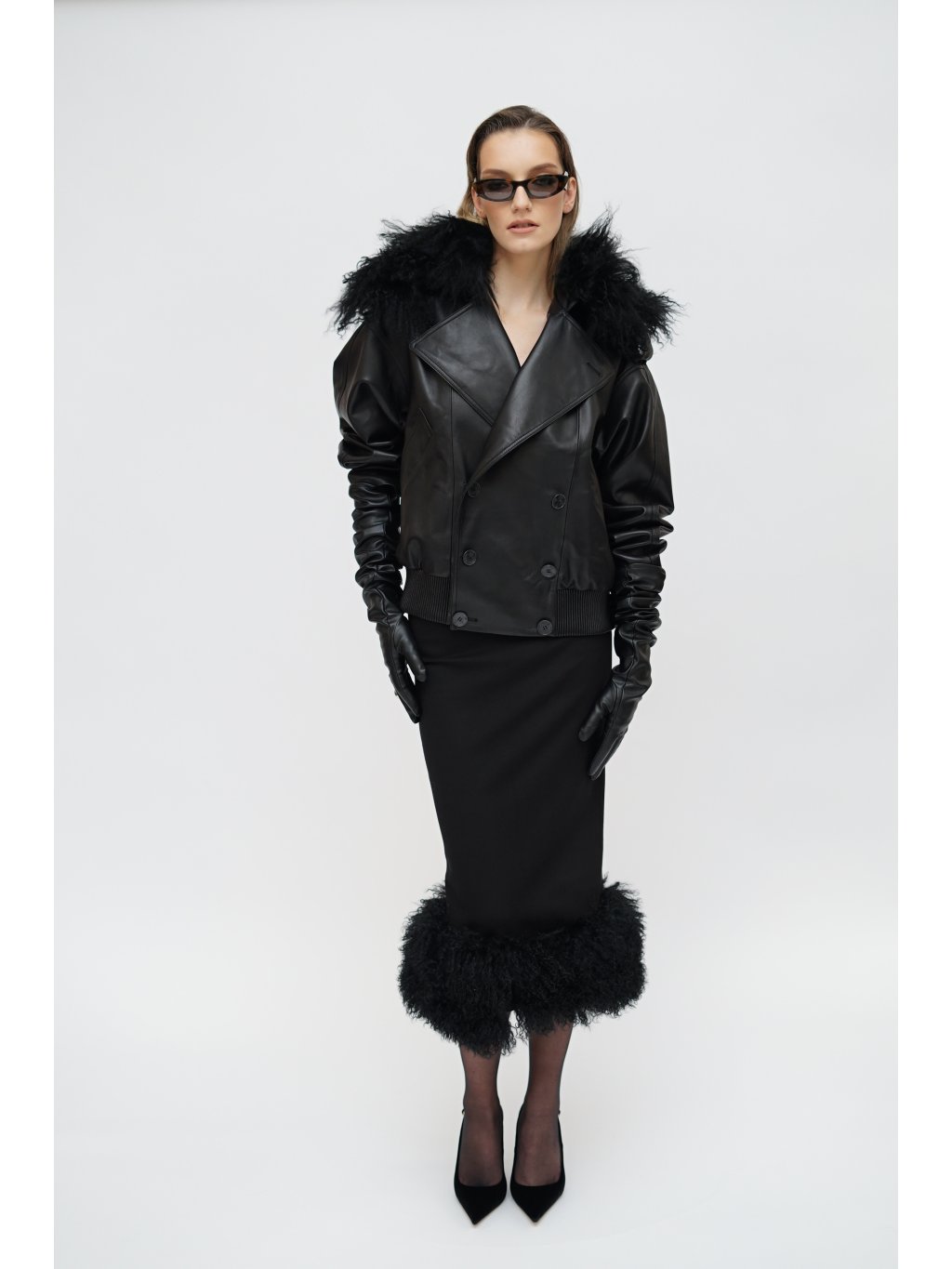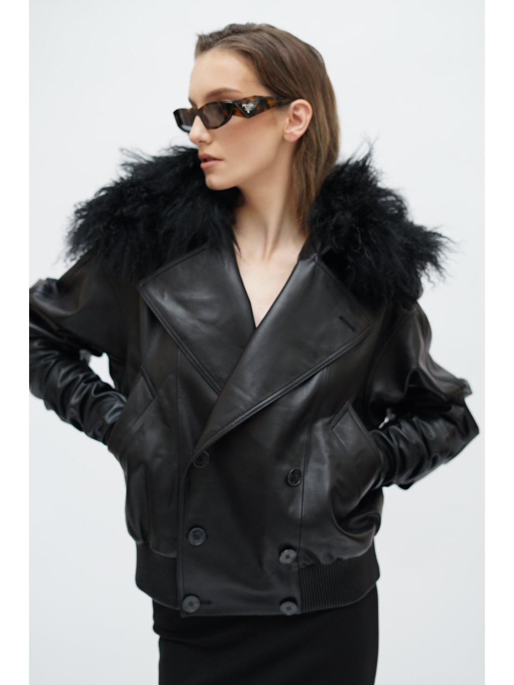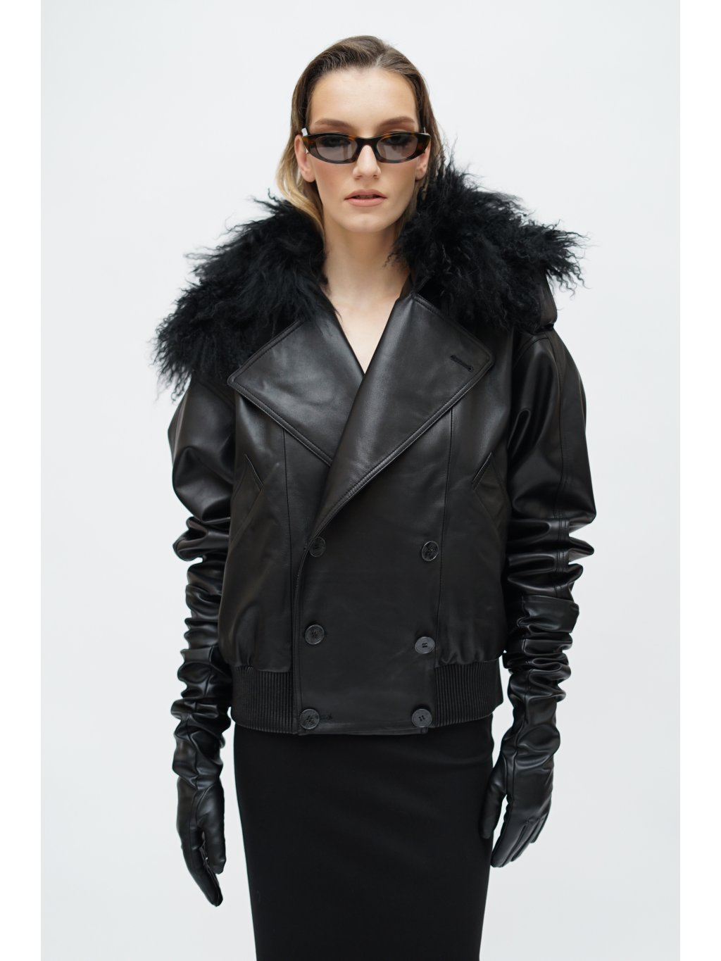 THE BLACK LEATHER BOMBER WITH MONGOLIAN LAMB COLLAR
