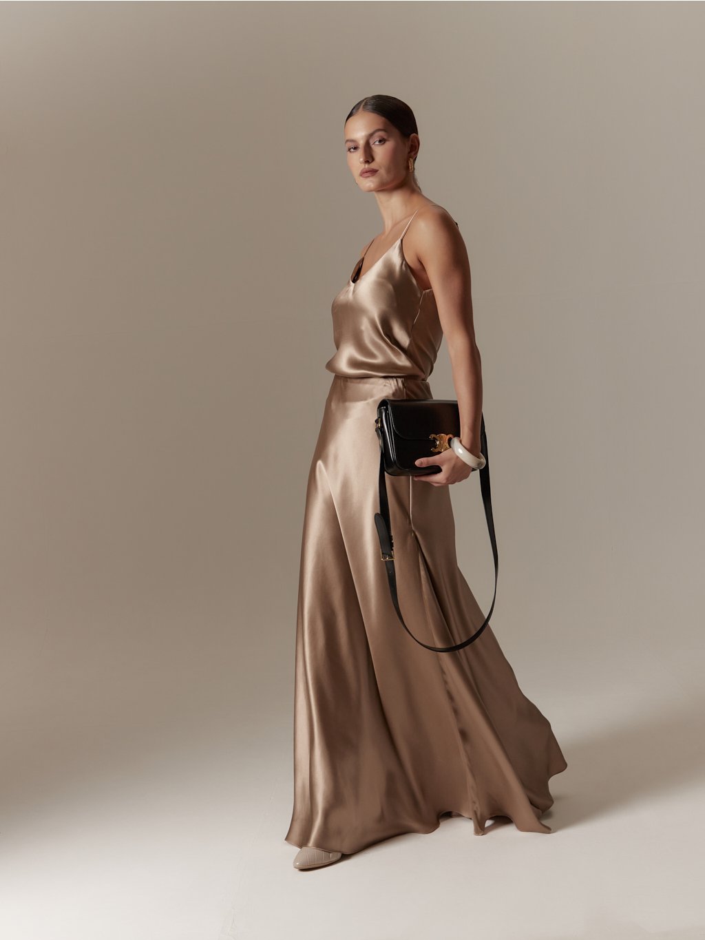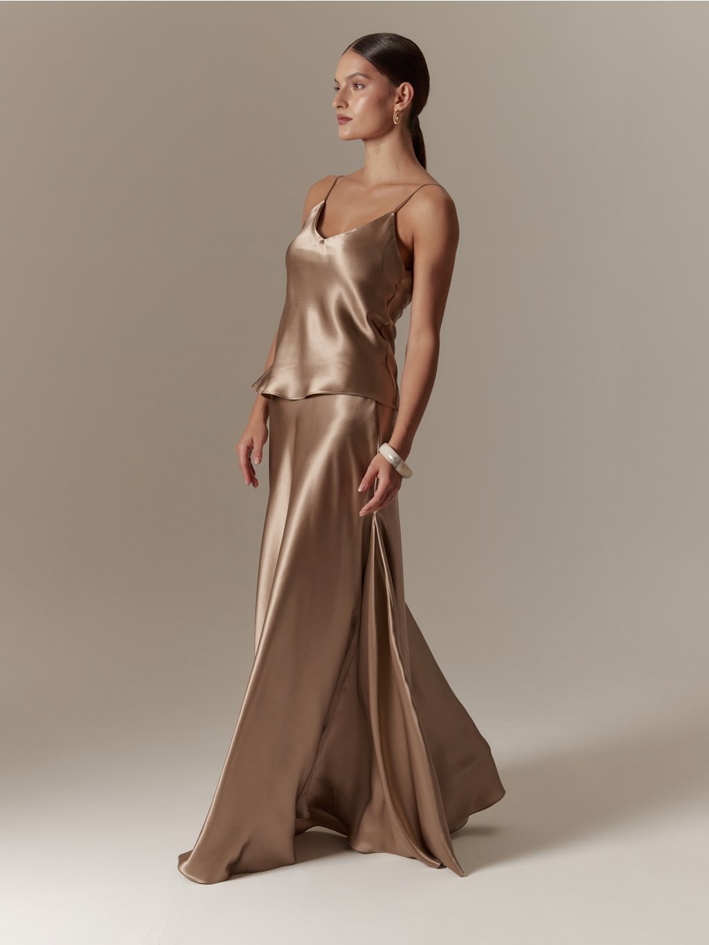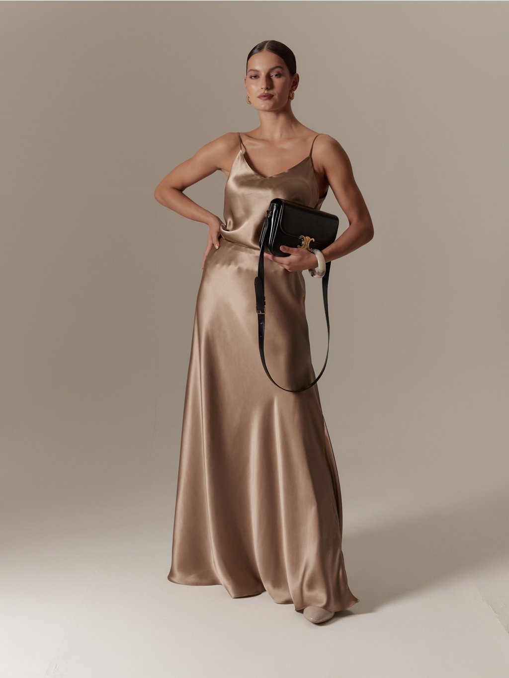 - Vyrobeno ze šikmo střiženého hedvábného saténu, jehož unikátní vlastností je, že respektuje ženskou siluetu, neobepíná a s tělem krásné splývá, díky tomu nabízí velkou variabilitu pro různé postavy, s rozdílnými mírami, aniž by šaty působily malé či velké, zvolte proto svou běžnou velikost.