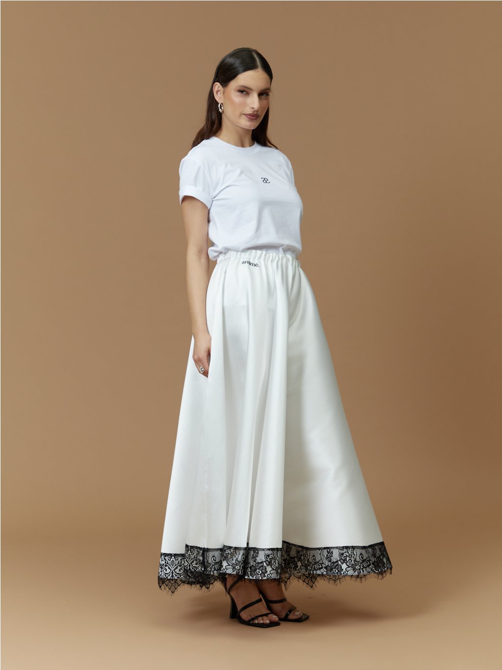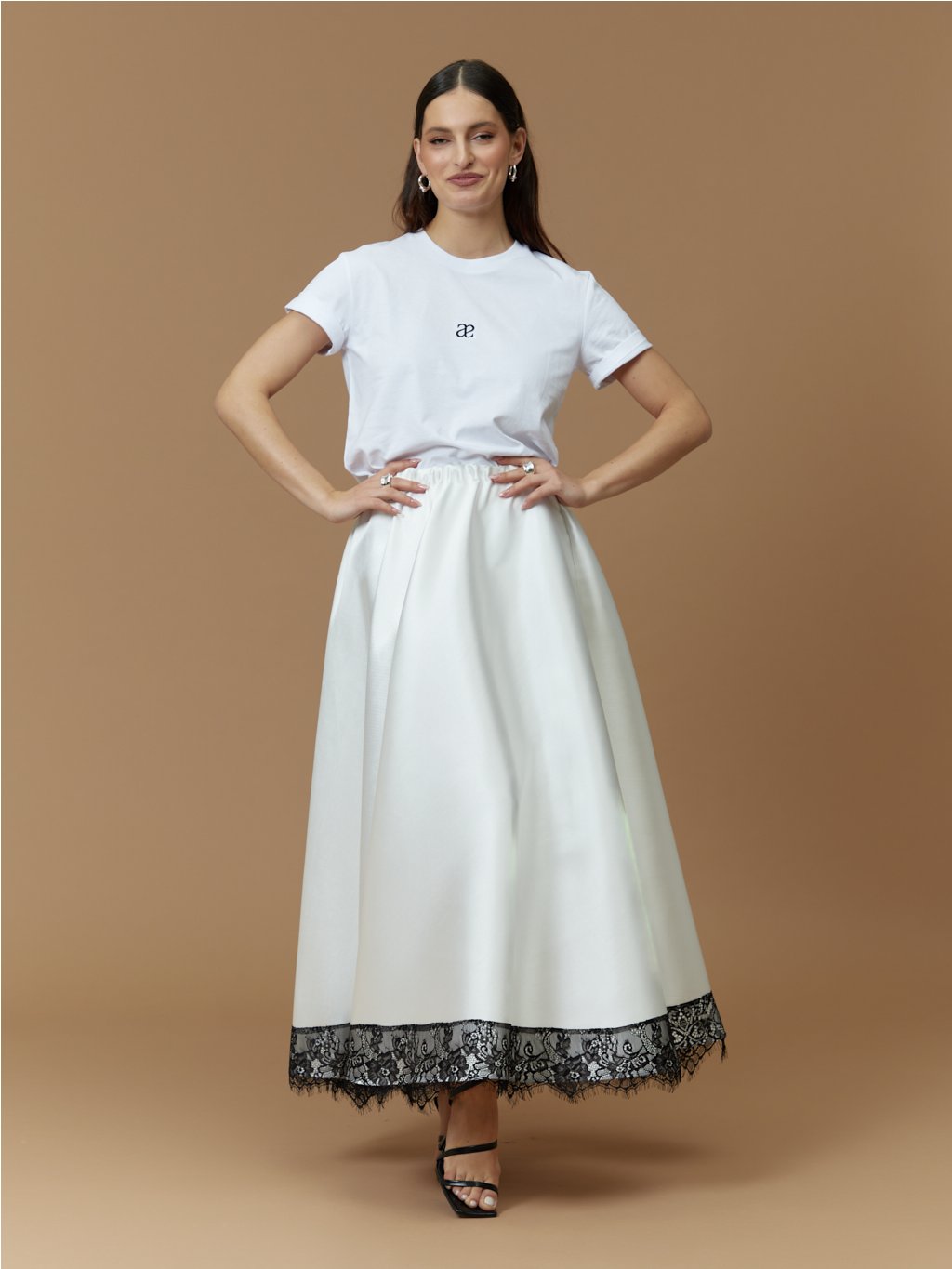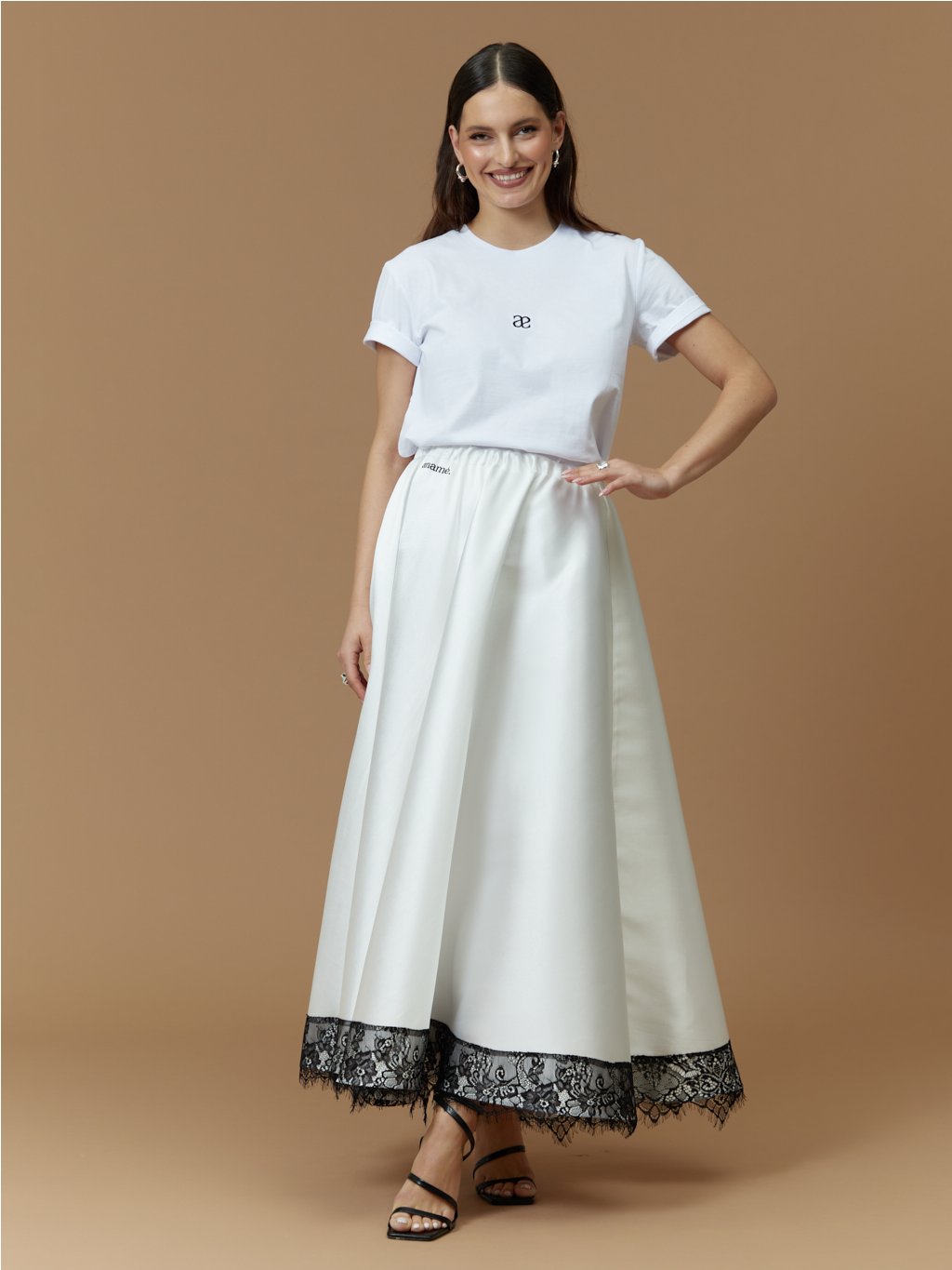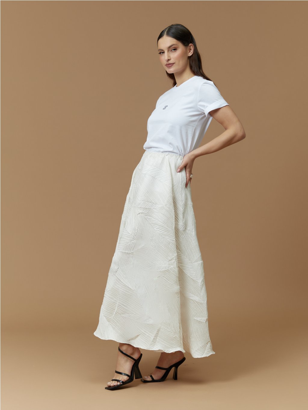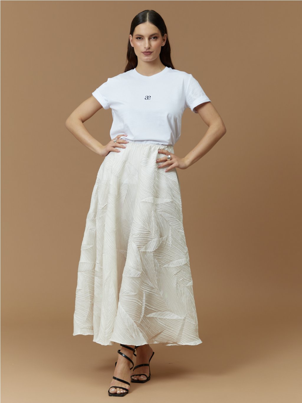 Modelka měří 169 cm. Běžně nosí velikost 36. Na sobě má velikost S.